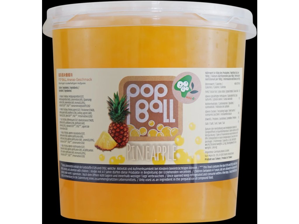 Přidejte do svého Bubble Tea sladkou a tropickou chuť ananasu s ananasovými Pop Ball! Tyto malé želé kuličky jsou plné osvěžujícího ananasového aroma, které přináší do vašeho nápoje plnou sladkost a exotiku ananasu. Každý doušek vašeho Bubble Tea nápoje se stane osvěžujícím a lahodným zážitkem, kdy se tyto kuličky rozpustí na jazyku, uvolňující sladkou šťávu a chuť tropického ovoce. Přidejte je do svého nápoje a užijte si každý doušek s autentickou ananasovou chutí. S ananasovými Pop Ball se vaše Bubble Tea stane tropickým a osvěžujícím požitkem plným sladkého a svěžího ananasu.
